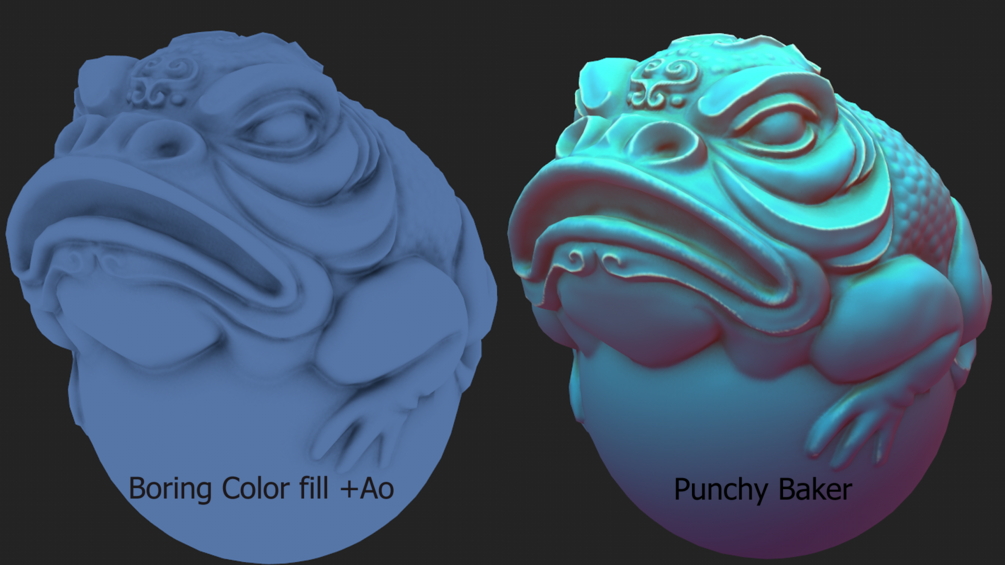 Punchy Baker at it's core, generates lighting into your base color from your model's mesh maps. It provides you with total control of light position along with the color of your light and shadows. It also combines information from your curvature, position, and ambient occlusion for even more colorization.